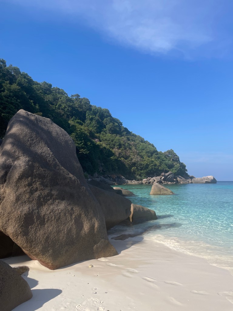El agua azul turquesa, la arena blanca, piedras grises gigantes lleno de naturaleza verde.